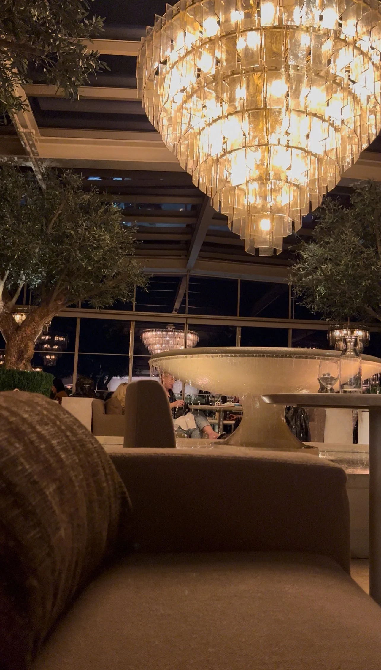 At 97,000 square feet, it’s their largest store yet, towering over the West Palm Beach and Chicago locations I had been to. The entire space is bright, elegant, and layered with chandeliers, greenery, and floor-to-ceiling windows facing the ocean. The restaurant features two beautiful outdoor courtyards, one on each side, where we sat. The courtyards are immaculate, with planters creating a private, intimate feel between tables. Seating is comfortable and lounge-like, and each table outside has umbrella-attached heaters, so no need for those clunky rolling gas lamps. A large fountain in the center adds to the atmosphere while conveniently drowning out any nearby conversations.
