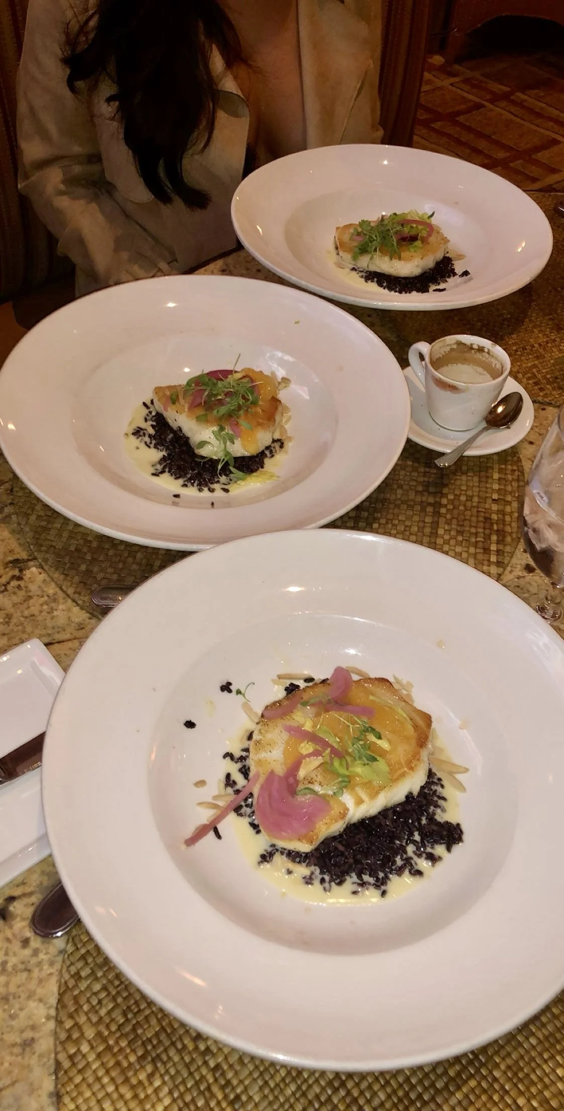 On our most recent visit, we again sat in the lounge area near the fireplace and under the TVs to watch the NBA Finals. For dinner, we ordered the Chilean sea bass, braised beef short rib, gnocchi with spring vegetables, and a side of their house bread. For context, the sea bass recipe has remained unchanged on their menu for years as it’s one of their most popular dishes. Served on a bed of black forbidden rice with pickled shallots, citrus, toasted almonds, and coconut beurre blanc, the combination is exceptional and delicious every time. This dish is always a must-order for me. The short rib was perfectly cooked, served over black truffle whipped potatoes with a rich bordelaise sauce, another consistently great choice. The gnocchi with spring vegetables was something new we tried as an appetizer. It was good but not particularly memorable.
